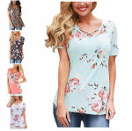 Casual Floral Top Cotton Short Sleeve Criss Cross V-Neck Floral Women T-shirt